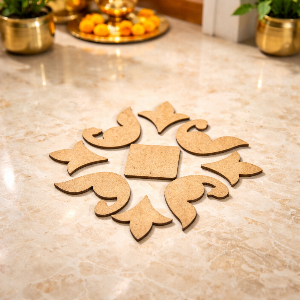 Upgrade your festive décor with the DIY MDF Swirl Rangoli Base Set for Festive Decor—a unique, reusable rangoli layout made from premium MDF. This set includes a sturdy center square base with matching swirl and corner motifs that help you create a clean, symmetrical rangoli design without mess. The smooth MDF surface is perfect for acrylic painting, mirror work, kundan, pearls, glitter, decoupage, or clay detailing, making it ideal for beginners and craft lovers. Use it for Diwali decorations, pooja room décor, wedding entrances, housewarming setups, or festive gift hampers. Create your own designer look every season with the DIY MDF Swirl Rangoli Base Set for Festive Decor.