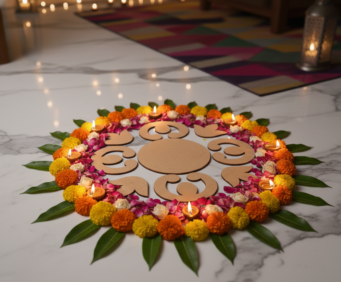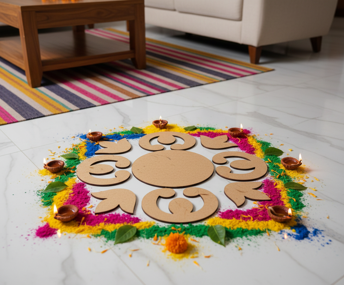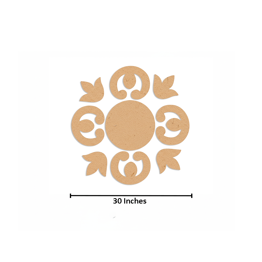 This MDF Floral Rangoli Pattern Craft Set includes a round center base with matching floral and curve-shaped elements that can be arranged in multiple creative designs. It is ideal for rangoli decoration, table décor, wall art layouts, and festival craft activities The smooth MDF surface is perfect for acrylic painting, dot mandala, resin work, decoupage, lippan art, glitter decoration and mirror work. This set is widely used during Diwali, Navratri, pooja room décor, wedding decoration and home entrance decoration