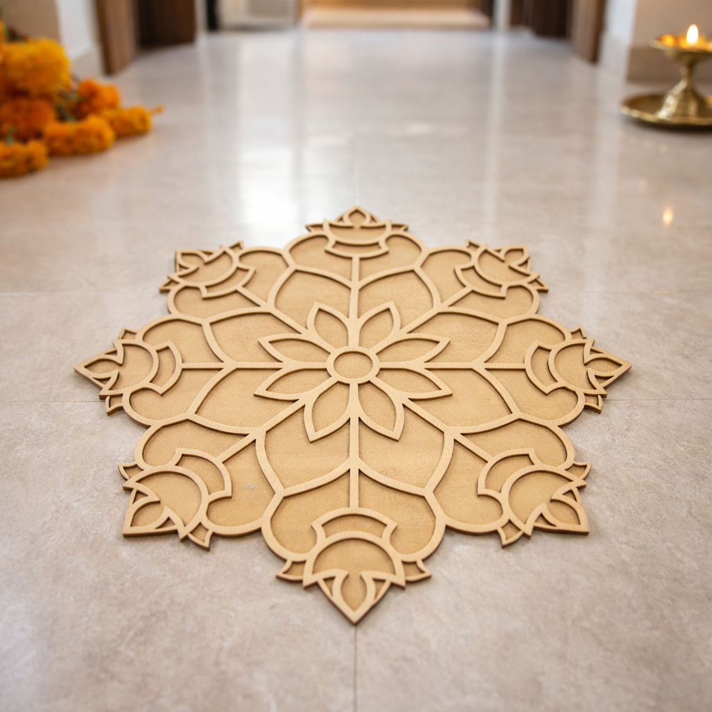 Upgrade your festive decoration with this MDF Layered Mandala Rangoli Base featuring a rich floral mandala design with beautifully raised layers for a 3D look. This base is ideal for creating eye-catching rangoli arrangements for your entrance, mandir area, and festive corners. The smooth MDF surface and layered detailing make it perfect for acrylic painting, dot mandala, mirror work, kundan decoration, glitter highlights, lippan art, decoupage, and resin finishing. Create a luxury rangoli for Diwali, Navratri, Lakshmi pooja, weddings, housewarming functions, and reuse it every season.