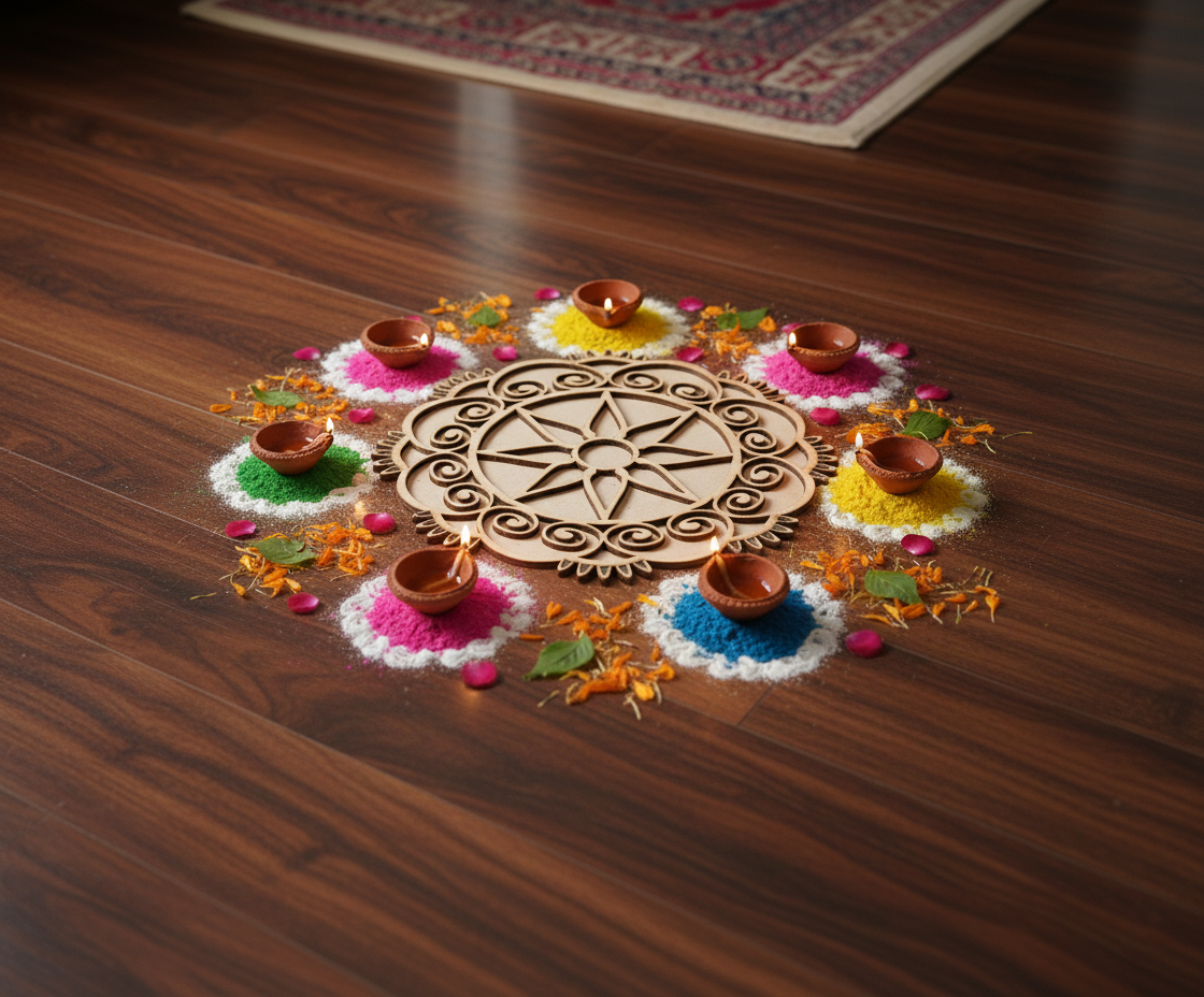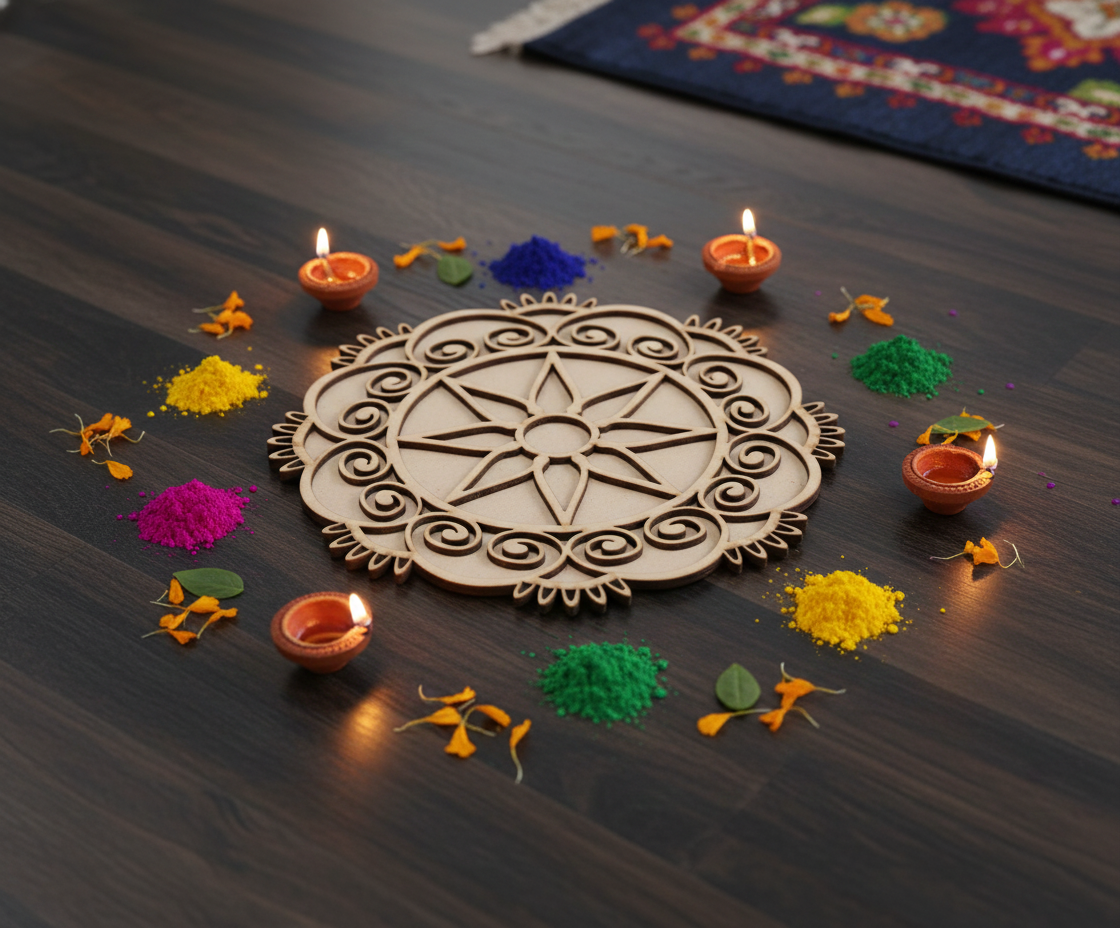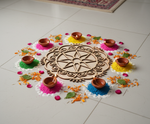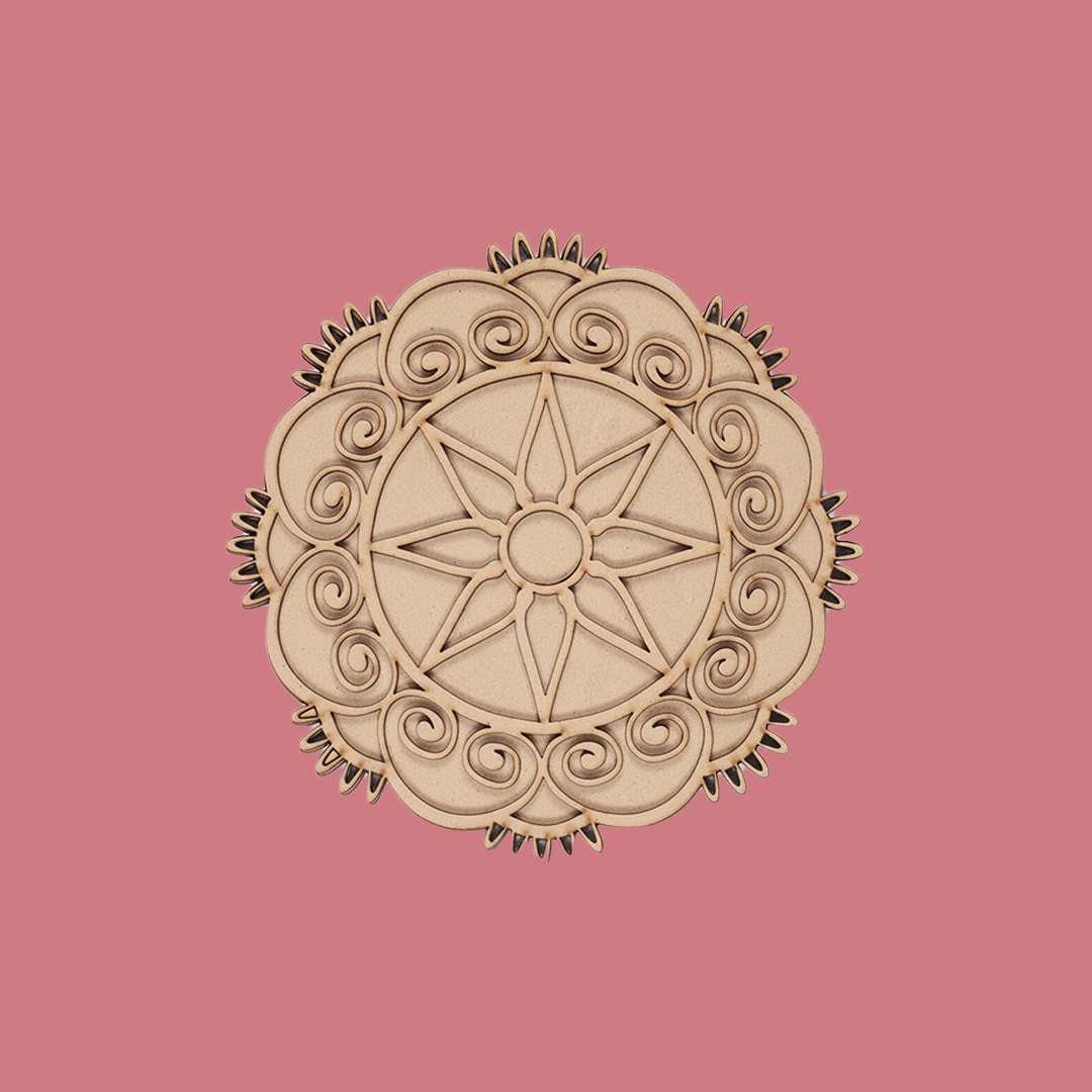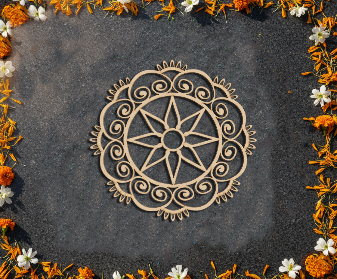 Create a stunning festive floor setup with the MDF Star Petal Round Rangoli Base Cutout, featuring a star-petal centre design and elegant swirl detailing around the edges for a rich traditional look. The smooth MDF surface is ideal for acrylic painting, dot art, mirror work, kundan decoration, glitter highlights, lippan art, decoupage, and resin coating—giving you clean finishing and easy detailing. Use it for Diwali decoration, Navratri décor, Lakshmi pooja, weddings, and housewarming functions—decorate once and reuse every season with the MDF Star Petal Round Rangoli Base Cutout