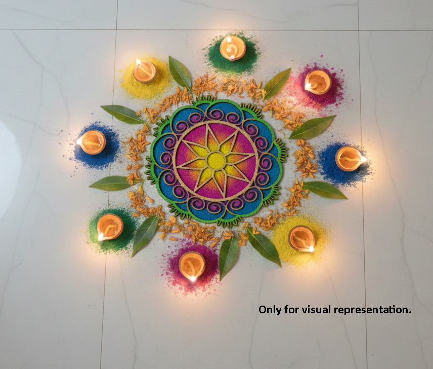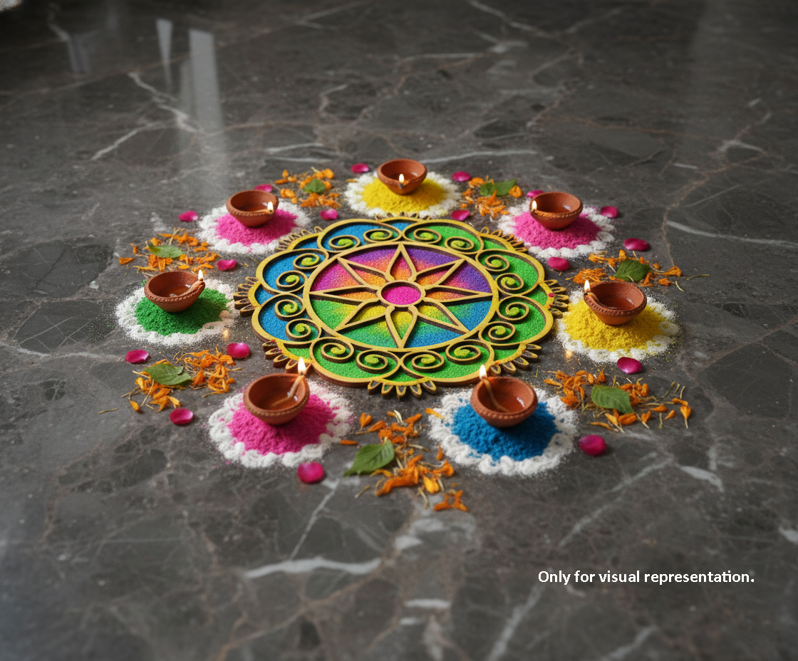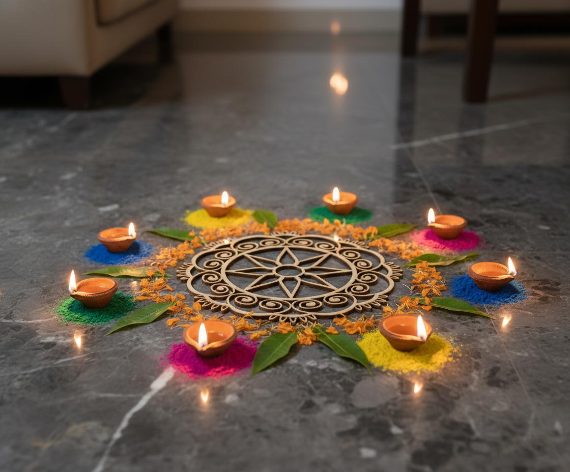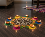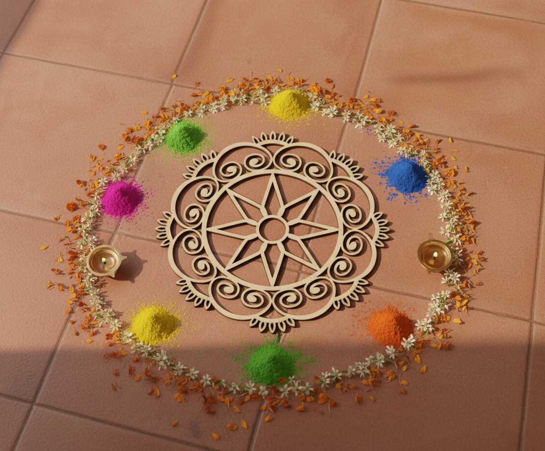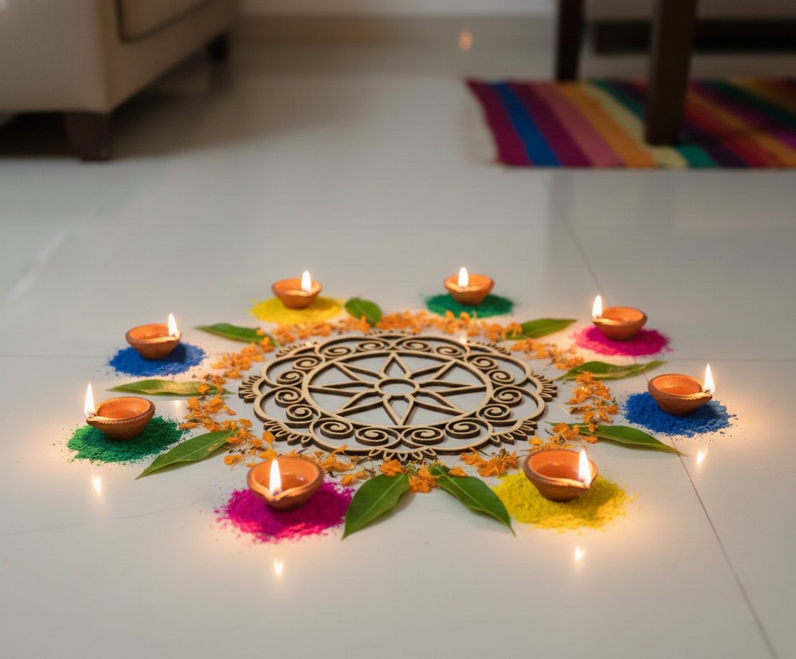 Create a stunning festive floor setup with the MDF Star Petal Round Rangoli Base Cutout, featuring a star-petal centre design and elegant swirl detailing around the edges for a rich traditional look. The smooth MDF surface is ideal for acrylic painting, dot art, mirror work, kundan decoration, glitter highlights, lippan art, decoupage, and resin coating—giving you clean finishing and easy detailing. Use it for Diwali decoration, Navratri décor, Lakshmi pooja, weddings, and housewarming functions—decorate once and reuse every season with the MDF Star Petal Round Rangoli Base Cutout