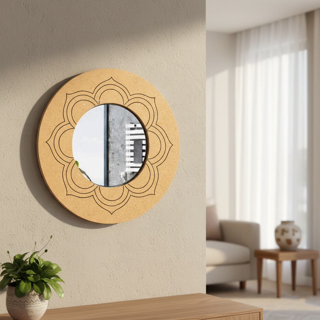 Add a clean and elegant touch to your interiors with the MDF Lotus Outline Round Wall Mirror for Home Decor, featuring a simple lotus-line border that suits modern as well as traditional spaces. This ready-to-use mirror brightens your living room, bedroom, hallway, entryway, dressing area, or pooja corner and instantly upgrades wall styling. The MDF border can also be customised with paint, resin coating, metallic highlights, or subtle embellishments to match your theme and create a unique décor piece. Make your space look bigger, brighter, and more premium with the MDF Lotus Outline Round Wall Mirror for Home Decor
