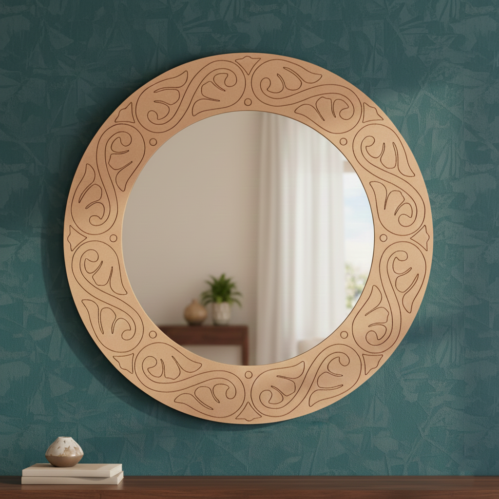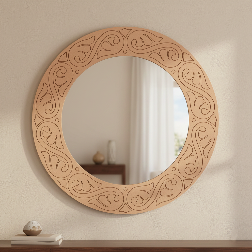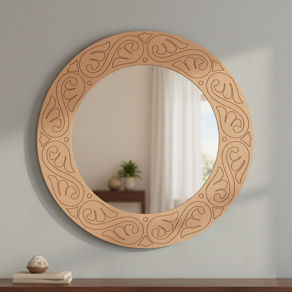 Add a premium accent to your interiors with the MDF Scroll Round Wall Mirror for Home Decor, featuring an elegant engraved swirl border that suits both modern and traditional spaces. This ready-to-use mirror brightens up your living room, bedroom, hallway, entryway, dressing area, or pooja corner while adding a classy decorative touch. The MDF border can also be customised with paint, resin coating, subtle metallic highlights, or mirror work to match your theme. Elevate your wall styling instantly with the MDF Scroll Round Wall Mirror for Home Decor